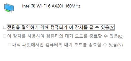 ์์ ๋ฒํผ ์ค๋ฅธ์ชฝ ํด๋ฆญ > ์ฅ์น ๊ด๋ฆฌ์ > ๋คํธ์ํฌ ์ด๋ํฐ > Intel(R) WiFi ~~ ์ค๋ฅธ์ชฝ ํด๋ฆญ ์์ฑ > ์ ์ ๊ด๋ฆฌ ํญ ์ ์์ ์ ์ฝํ๊ธฐ ์ํด ์ปดํจํฐ๊ฐ ์ด ์ฅ์น๋ฅผ ๋ ์ ์์ ์ฒดํฌ ํด์